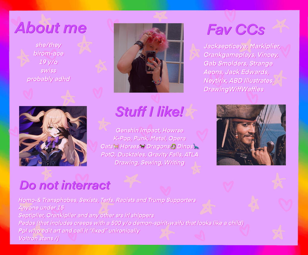 I curse, sometimes vent and use caps a lot. Some of my drawings can be disturbing for some audiences, I try my best to properly TW and CW them. I also tend to tweet a lot about my hyperfixations, if you don't like them, pls just mute the keywords.